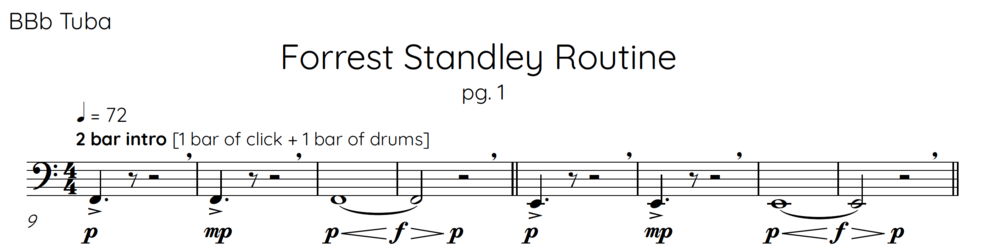 This is an accompaniment track for part of the horn routine by Forrest Standley. Other versions include: BBb Tuba, CC Tuba, Eb Tuba, F Tuba, Trombone/Euphonium, Horn in F, Trumpet in Bb, and Trumpet in C.