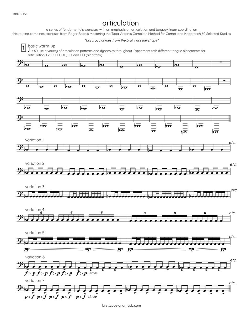 this routine for low brass instruments is comprised of fundamentals exercises with an emphasis on articulation and tongue/finger coordination