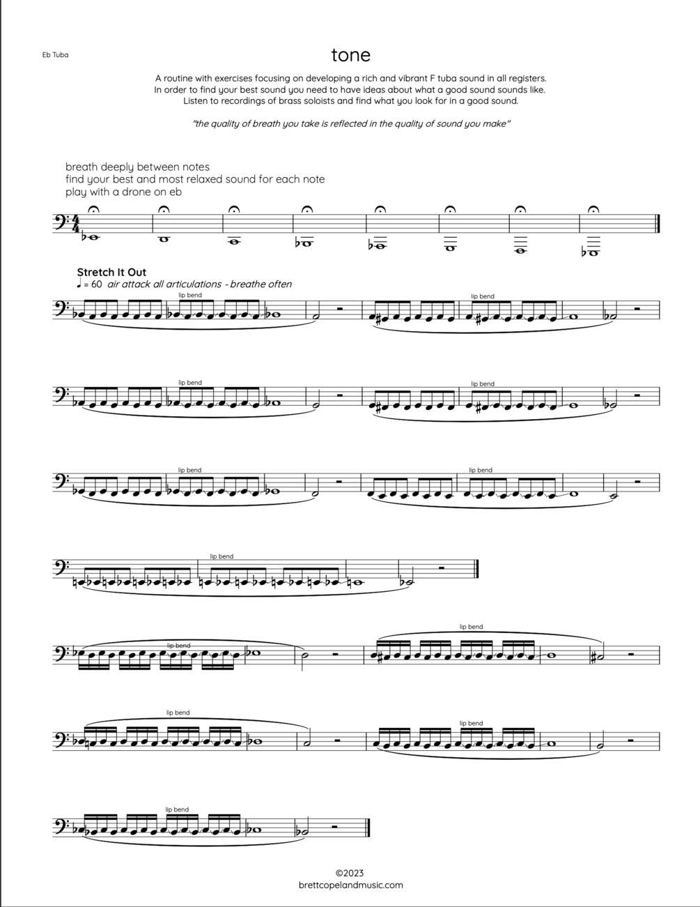 this routine is a combination of original exercises and exercises from the routines/pedagogical materials of Chris Olka, Derek Fenstermacher, Arnold Jacobs, Clarke, and Alessi.