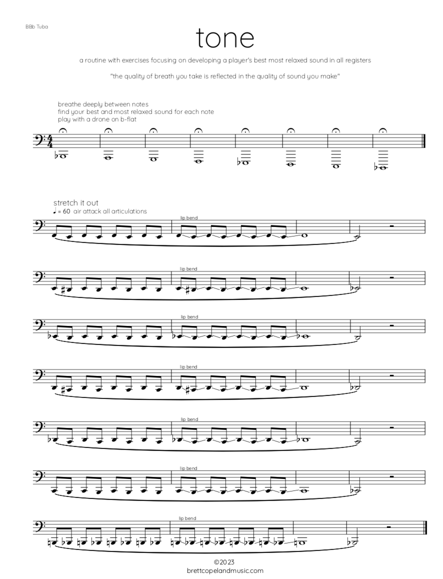 this routine is a combination of original exercises and exercises from the routines/pedagogical materials of Chris Olka, Derek Fenstermacher, Arnold Jacobs, Clarke, and Alessi.